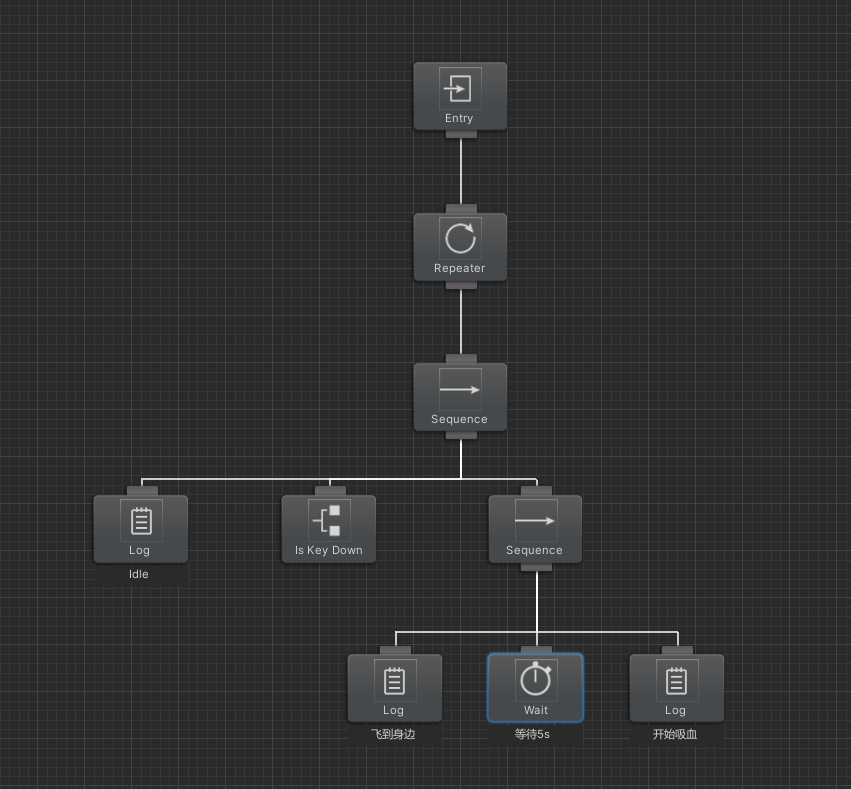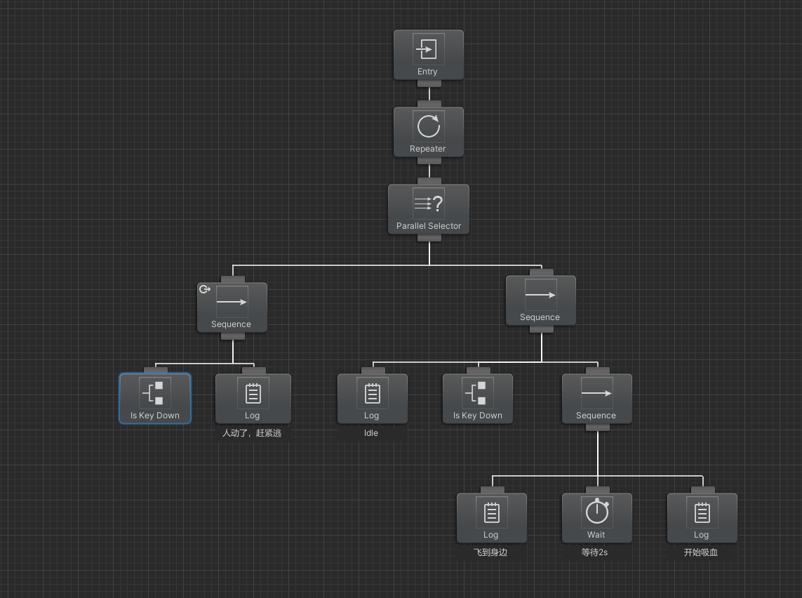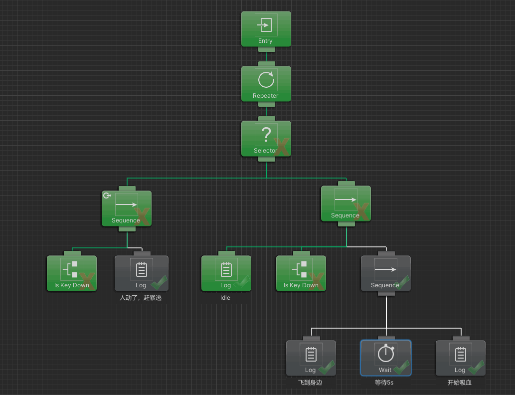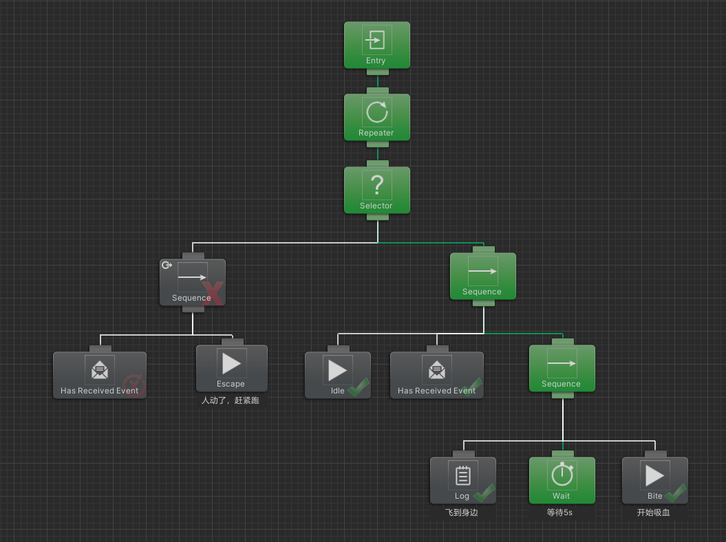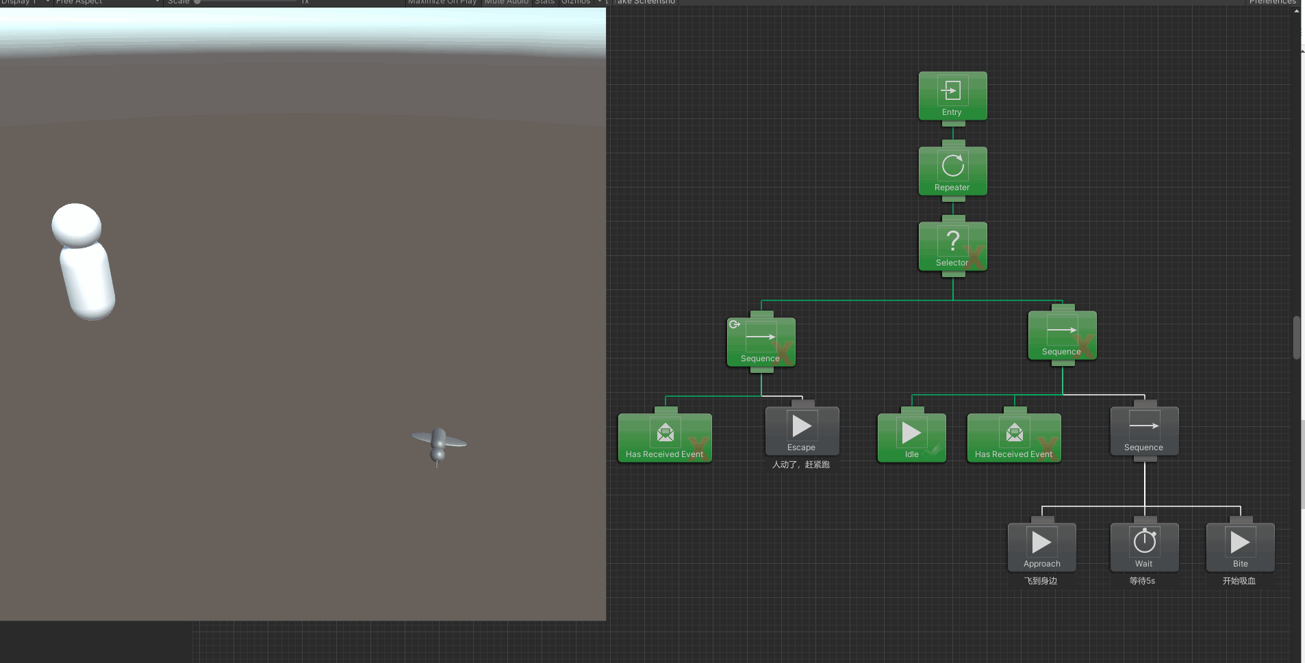 看教程不如手撸一遍。夏天到了,我们来实现蚊子的行为模式:循环执行检测附近是否有人,有人的话飞到身边,等待5s,5s后开始吸血,如果5s内人有动作,则中断等待,立刻逃走。